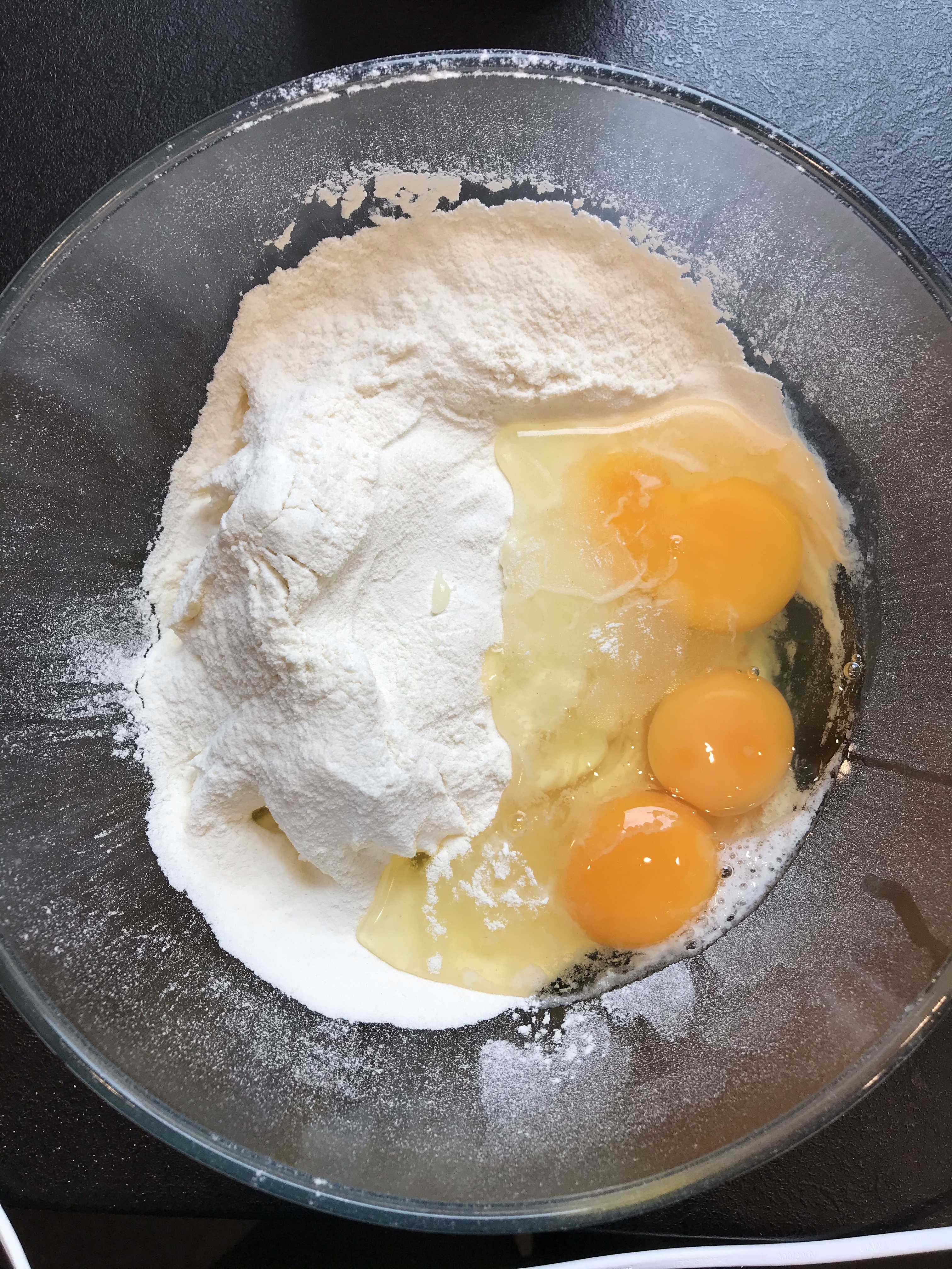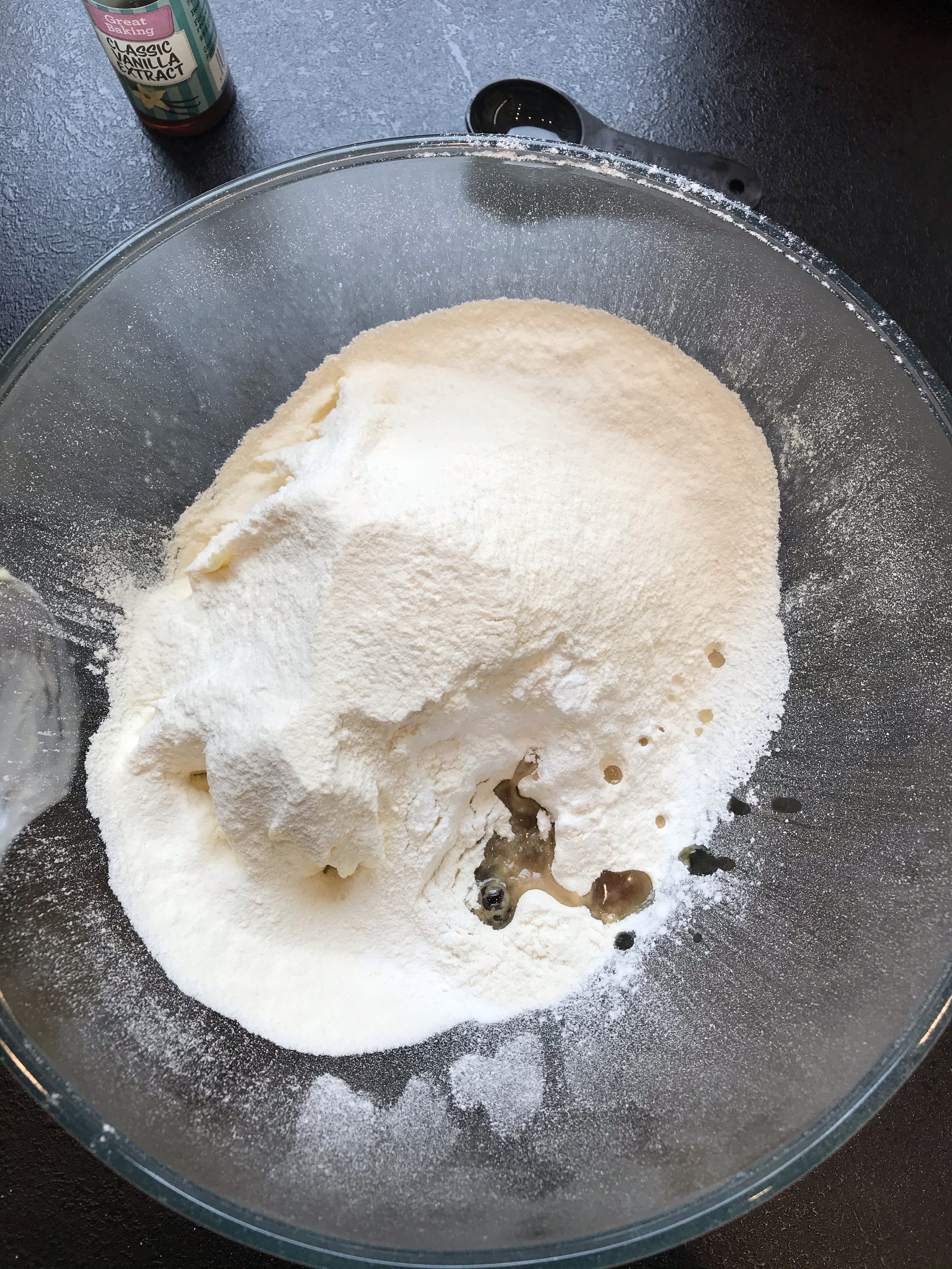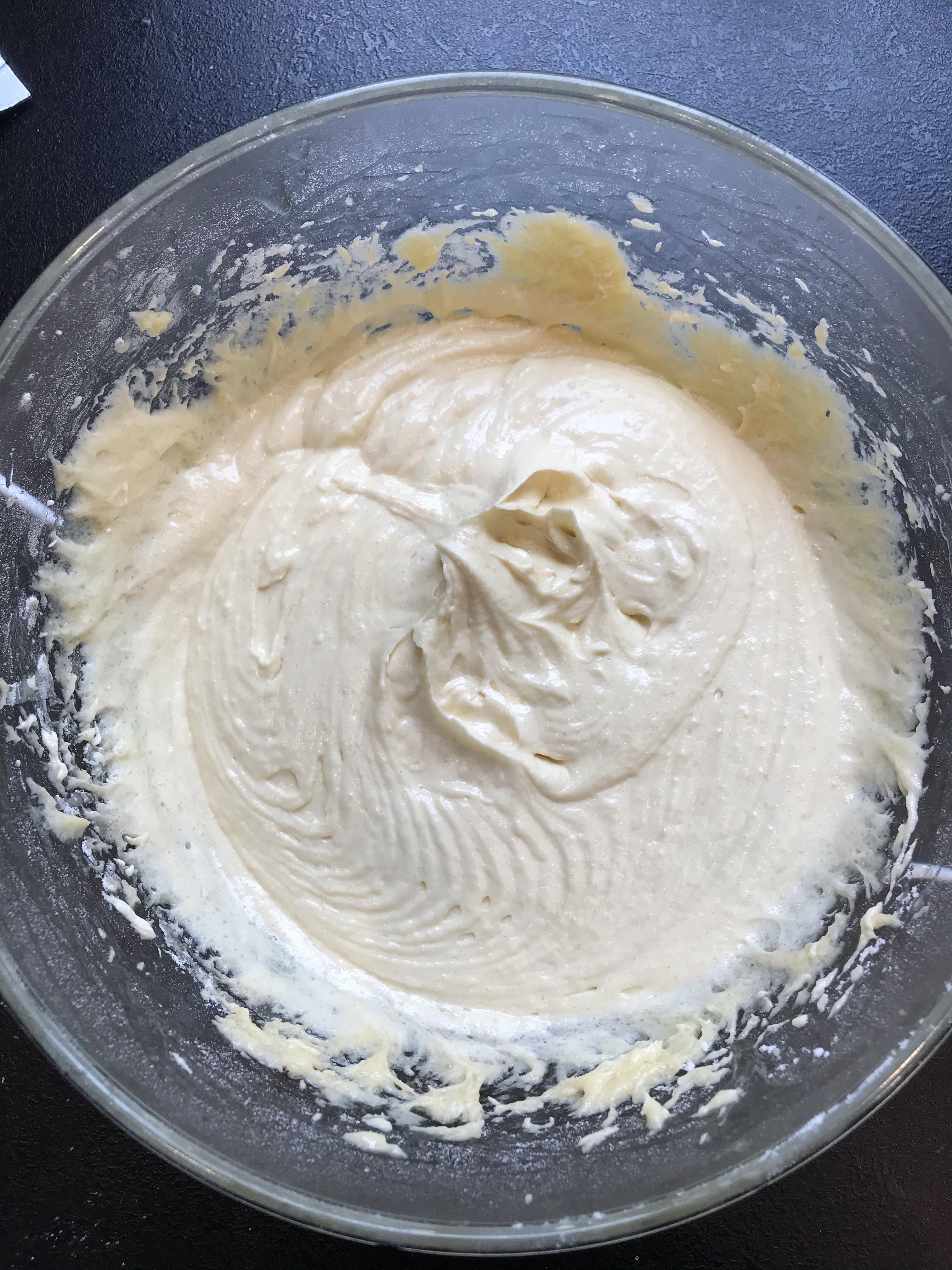 - Put the butter, sugar, vanilla, baking powder, flour and eggs in a large mixing bowl and mix with an electric whisk until smooth. If you don’t have an electric whisk, I recommend creaming the butter and sugar together until smooth first, then add in the vanilla extract and baking powder, followed by gradual additions of flour and egg. Mix until all the flour and eggs have been incorporated and you have a smooth batter.