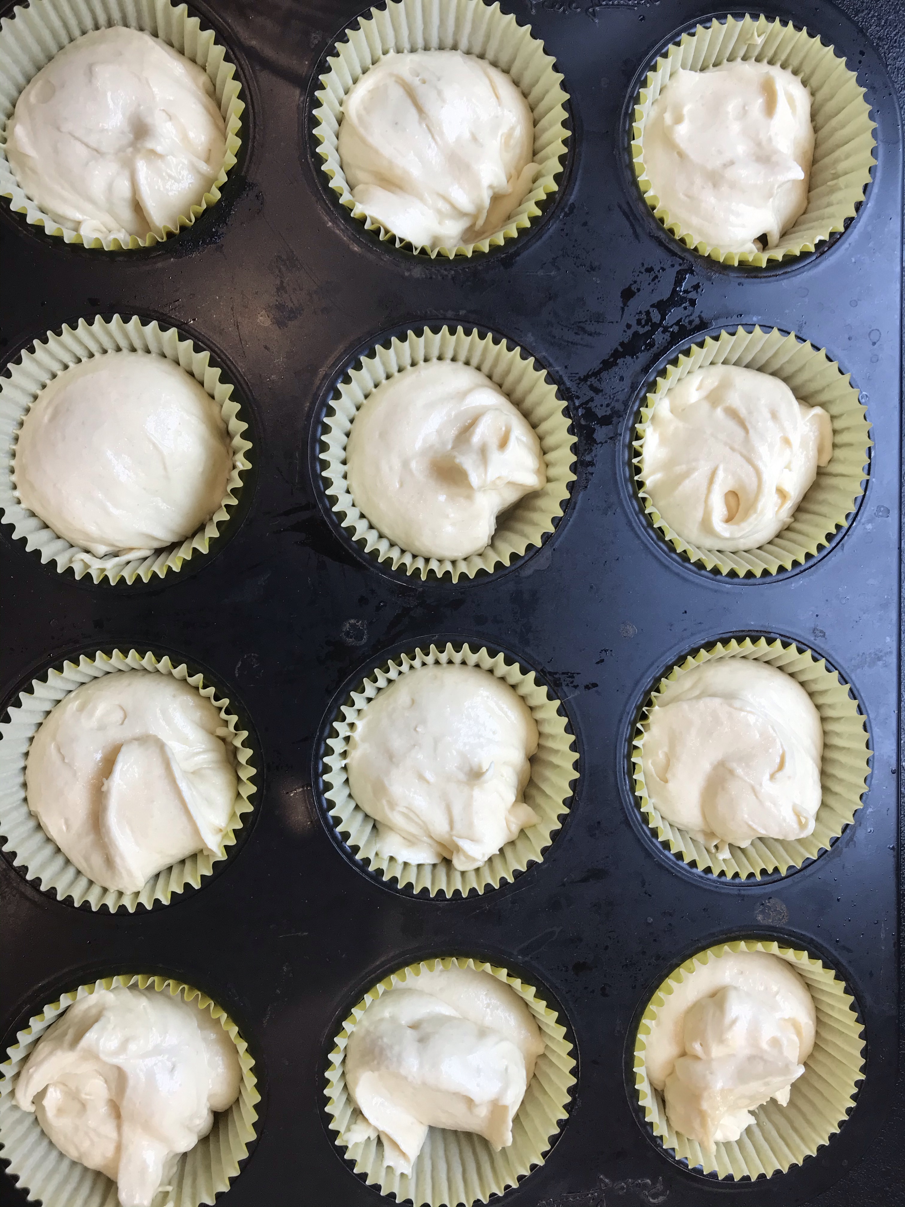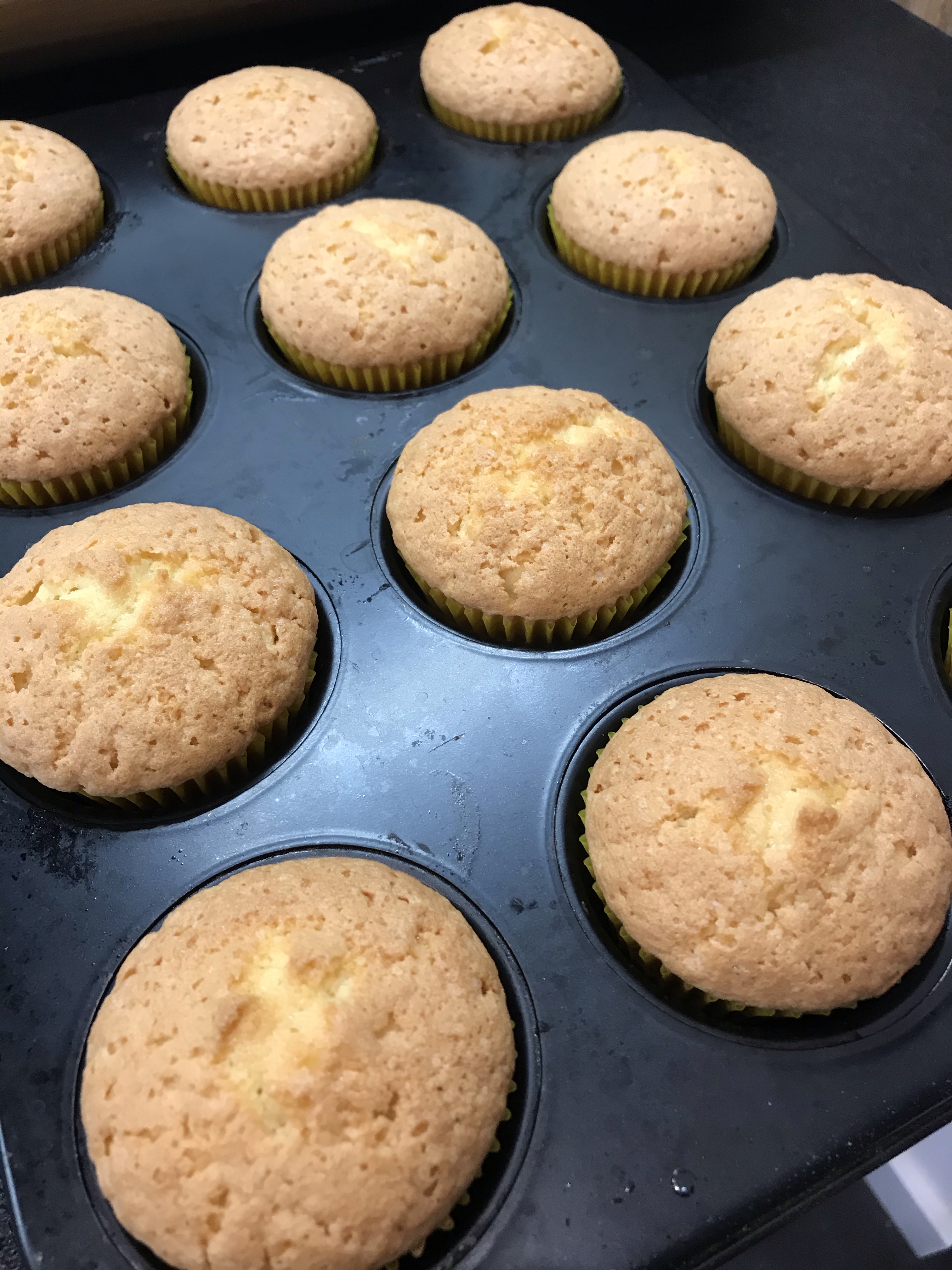 - Spoon the batter into the cupcake cases (about 2 tbs per cupcake). Bake in the oven for 15-20 minutes. They’re done when they’re springy to the touch or a skewer inserted into the sponge comes out clean. Allow to cool.