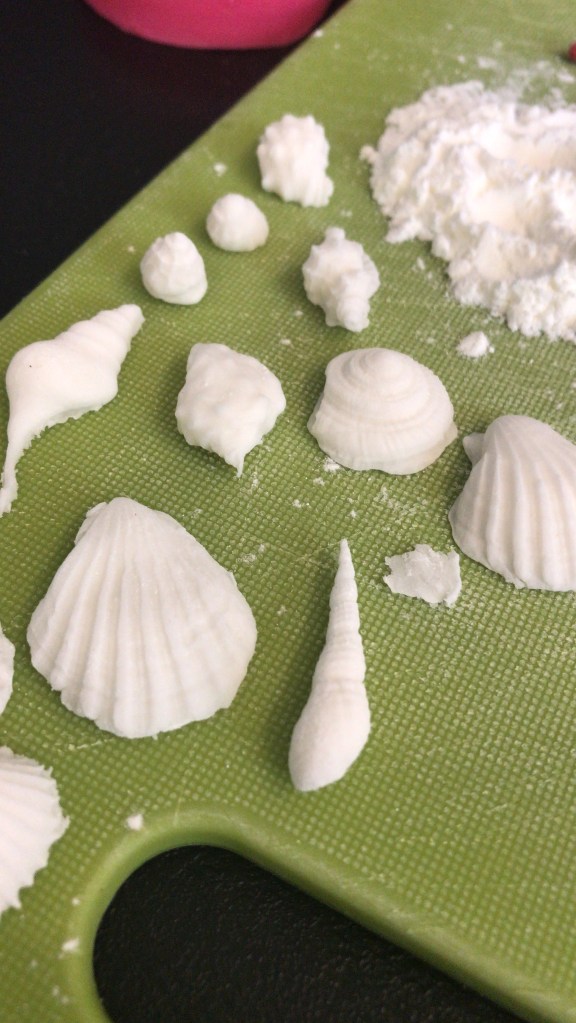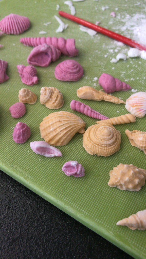 As you can see below, I coloured a lot of the shells. I used natural powdered food colouring tints that are uber powerful—I found that pinks, browns, yellows and oranges looked the most natural. Experiment with what you have in your baking cupboard and create some beautiful shells! Don’t shy away from making other sea-themed shapes like fish, seahorses, crabs …