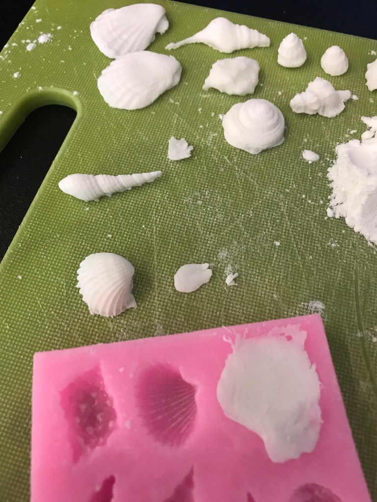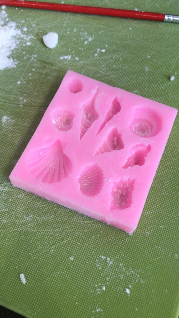 To mould modelling paste shells, all you have to do is brush a bit of corn flour inside the shell mould with a small (unused) paint brush. Tap out the excess or blow it out and you’re good to go. For the mermaid tails, I also sprinkled in some glitter into the mould BEFORE I added the paste. Next, cut off an appropriate amount of modelling paste, roll it in your hands to make sure it’s pliable and press it firmly into the shape you want to make. Make it as flat as possible, but if you’ve added too much paste for the shape you’re going for, simply slice the excess off with a knife. This might pull some of the paste away from the sides, so push the paste back into the edges as necessary.