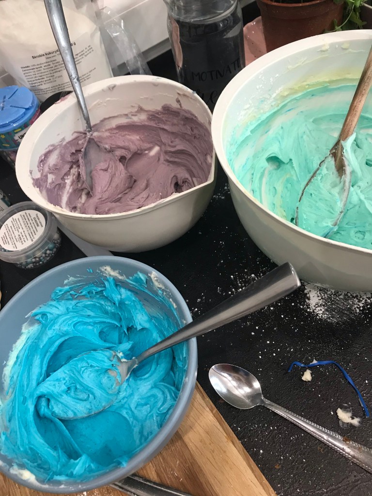 Make another batch of buttercream—this time half the above recipe (200 g butter / 400 g icing sugar). You’ll want a few bowls free for this one because you’ll be creating all kinds of colours! I went for pink, orange, bright green, yellow, and purple.