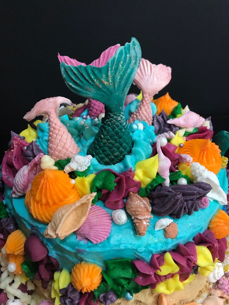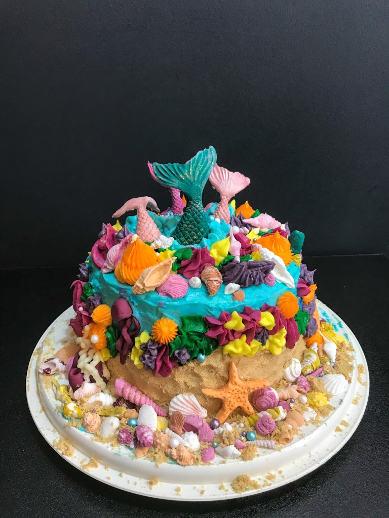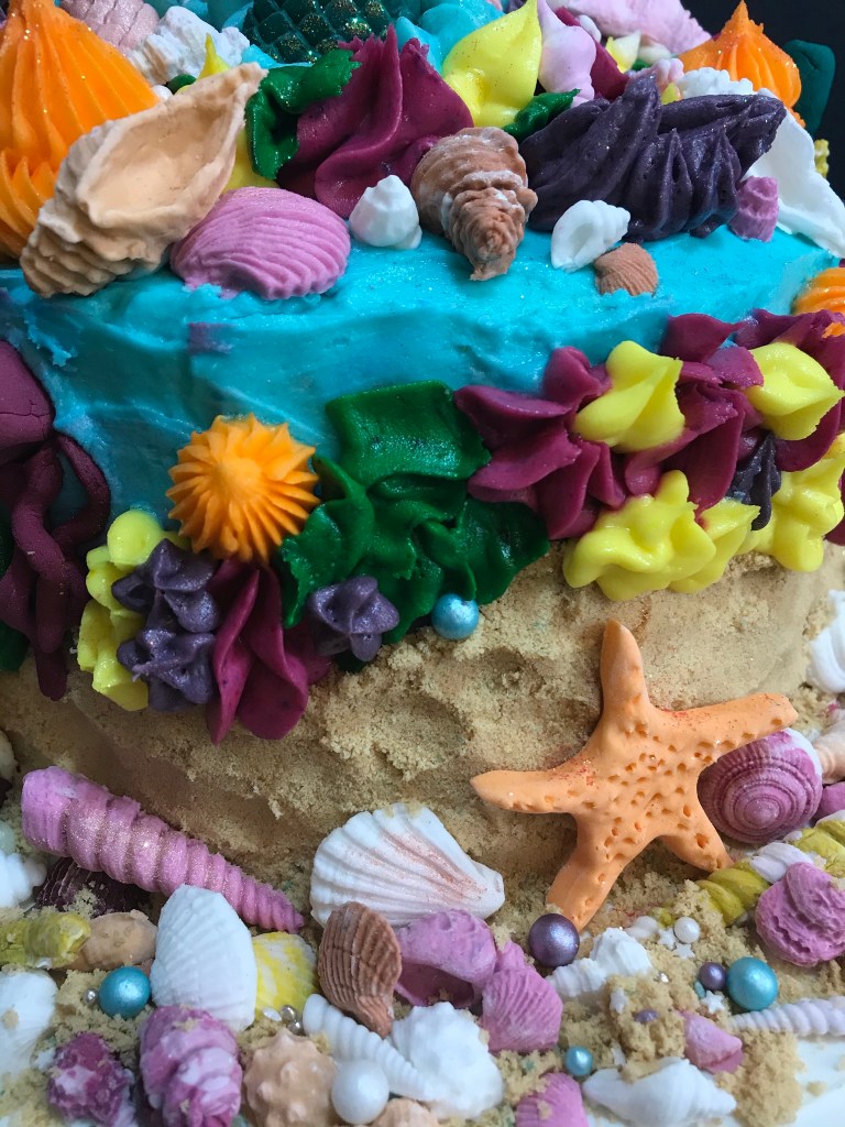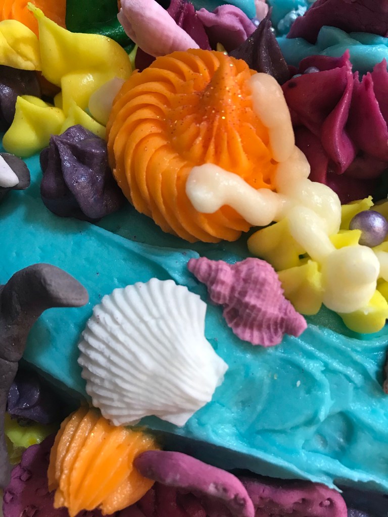 Now, it’s time to let your imagination run wild. Get a picture of a coral reef up on your phone for inspiration and get piping! My one suggestion would be to stick any shells that you want to place within the coral immediately after you’ve piped the buttercream before it goes too hard. Continue swirling on your edible coral and adding your edible shells. You can also get mermaid-themed sugar decorations too. Go crazy; this cake is anything but simple.