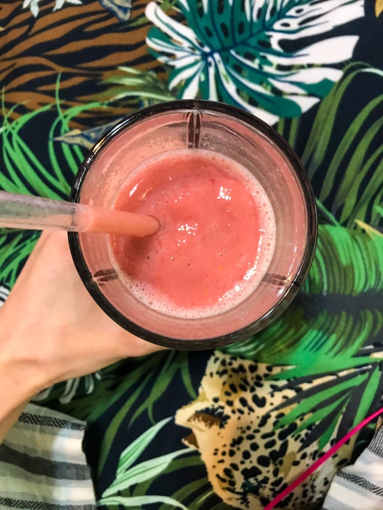 For this smoothie, I combine my beautiful watermelon with frozen strawberries and a banana to create a strawberry and banana smoothie 2.0 so to speak. I also add some camu camu powder for an extra mood booster. You don’t need to add these superfood powders but if you have it, why not? To bind my lovely fruits together, I pour some oat milk into the blender and pile on a cup of ice.