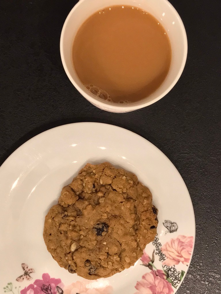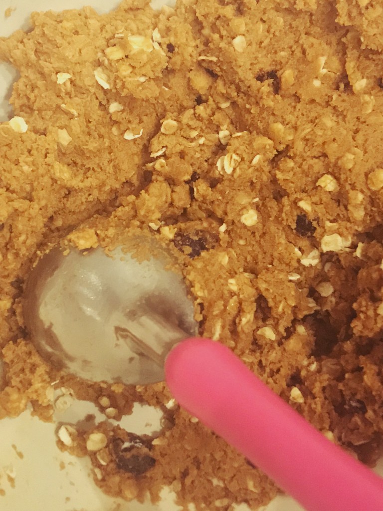 - Add the flour, bicarbonate of soda, salt, cinnamon and porridge oats. Mix until combined. Now fold in the raisins. Store the cookie dough in the fridge for minimum 20 minutes.