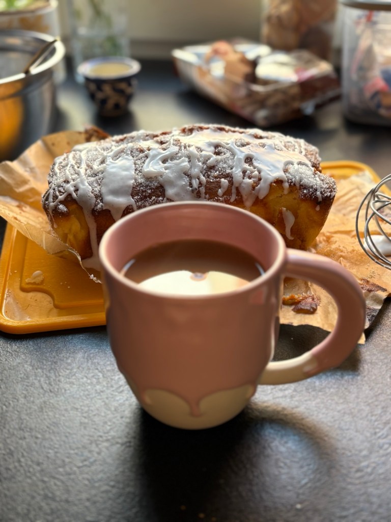 - Bake in a lined loaf tin for 30-40 minutes or until it springs back to the touch or a skewer comes out clean.