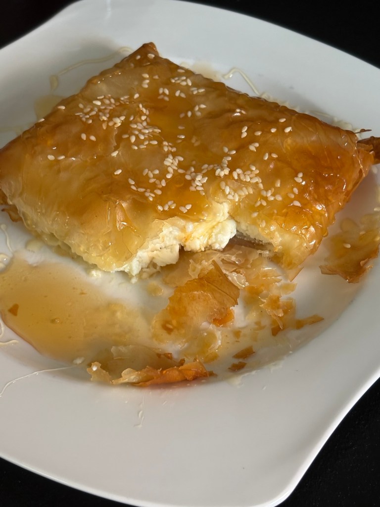 - Place the filo-wrapped feta on a lined baking tray with the folds underneath. Sprinkle with sesame seeds.