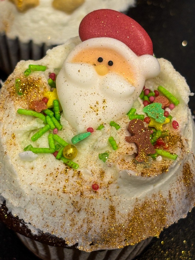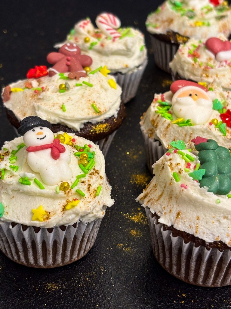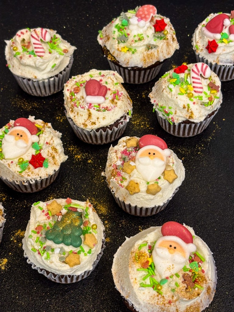 - Once the cupcakes are cool, spoon the icing onto them, using a butter knife to spread and swirl it around. Decorate with whatever festive decorations you have and maybe some edible glitter, if you feel so inclined.
