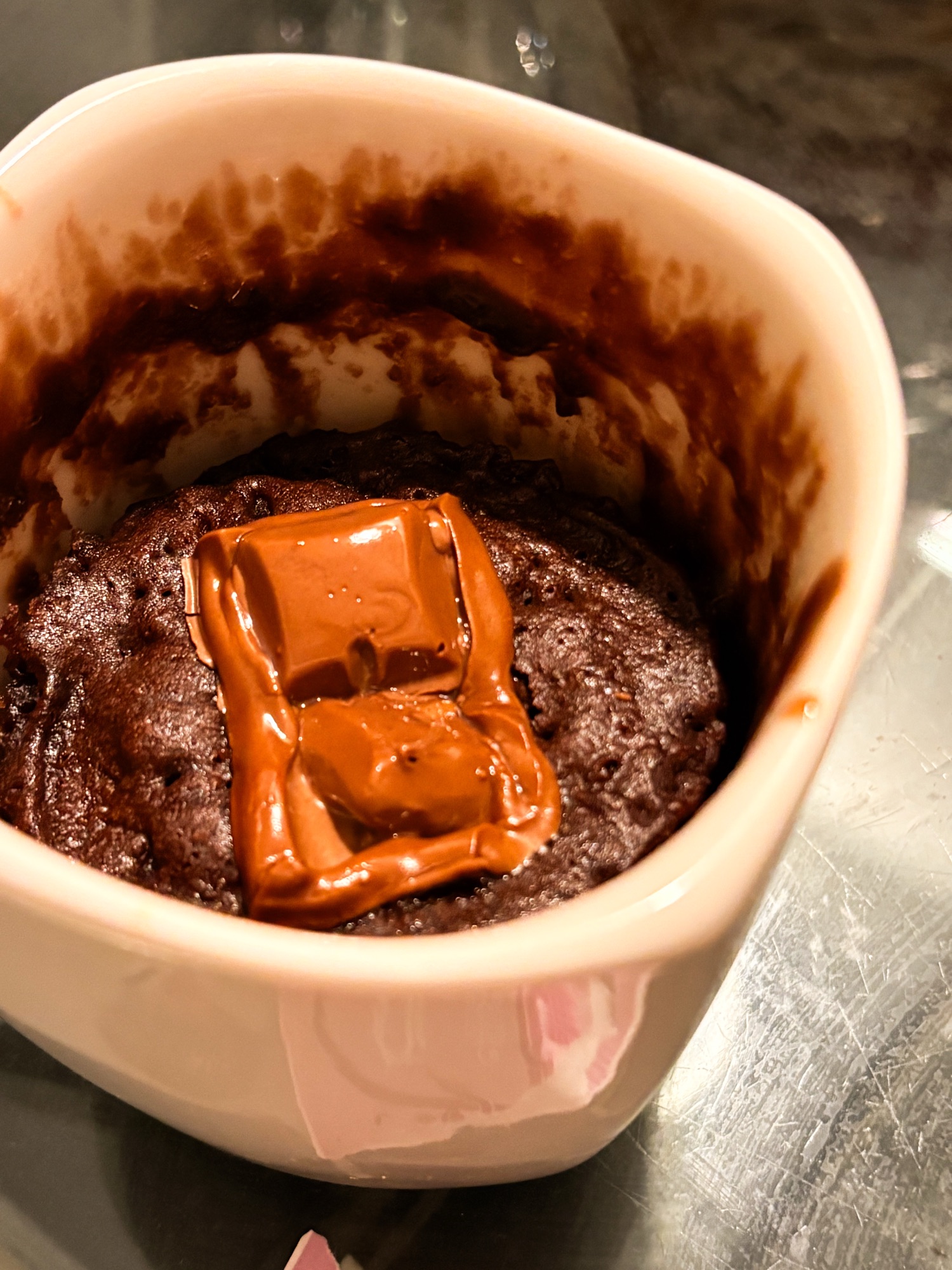 - I like to push a couple of cubes of chocolate into the hot mug cake to make it saucy. Enjoy with ice cream!